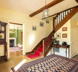 The part glazed front door opens to reveal a large reception hall with original stone flagged and quarry tiled floor with integral coats cupboard and an oak staircase with turned balusters gently rises to the two upper floors.