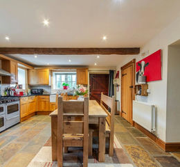 Inside, the property retains many attractive original features including exposed beams throughout, creating a warm and inviting atmosphere. The home opens into a spacious kitchen and dining room, providing a sociable hub for everyday living and entertaining. The kitchen is fitted with a range of units and includes integrated appliances such as a fridge, freezer and dishwasher.