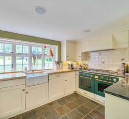 Features include a welcoming entrance hall with standalone wood-burning stove and a cloakroom/WC, a delightful open-plan farmhouse-style kitchen with Belfast sink, integrated appliances including double ovens with gas hob over, dishwasher and full height fridge freezer and a clearly defined dining area with built-in cupboards and double doors opening onto the terrace.