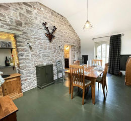 Open entrance porch with part glazed timber door to HALLWAY, tiled and oak flooring, high ceiling with recessed lighting and fitted cupboards. LIVING ROOM matching oak floor, double glazed window to rear and French doors to a beautiful cottage garden, freestanding contemporary wood burning fire on a flagstone hearth. Door to farmhouse style KITCHEN BREAKFAST ROOM with extensive range of Shaker style fitted cupboards and white spa worktops with inset porcelain double bowl sink , island unit and appliances including integrated dishwasher and electric Esse cooking range. Space for American style fridge freezer, shelved pantry, double glazed window to garden and access to DINING ROOM, vaulted ceiling with double glazed Velux window, exposed natural stonework to one wall, recessed display shelving, window to side and glazed door to garden. UTILITY / BOILER ROOM, space and plumbing for washing machine and tumble dryer, oil fired boiler and fitted cupboard, tiled floor and door to CLOAKROOM traditional Heritage white low level WC and pedestal wash hand basin.