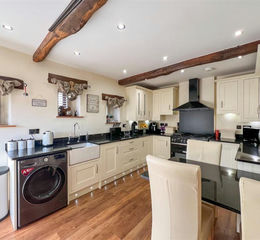 The kitchen is equipped with granite worktops and breakfast table, a Rangemaster five ring range oven, Rangemaster extractor hood, ceramic Butler sink, inset ceiling spotlights, plinth lighting, ceiling beams and under floor heating.