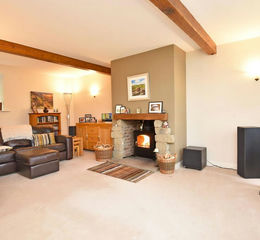 A large L-shaped reception room with windows to front and rear. Attractive fireplace with wood-burning stove.