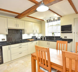 With a dining area. The kitchen comprises a range of stylish wall and base units with granite worktop. Integrated appliances including induction hob, two ovens (including one full-size oven and one combined oven / microwave), warming drawer, dishwasher, fridge / freezer, wine fridge and washer / dryer. Window and stable door to front. Under-floor heating.