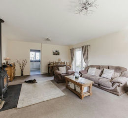 The bungalow itself has been modernised throughout and provides comfortable, well-proportioned accommodation. The home includes two double bedrooms and a bright dual-aspect lounge featuring a log-burner, creating a welcoming central living space. The layout is practical and well-suited to everyday living, with an emphasis on natural light and straightforward functionality.
