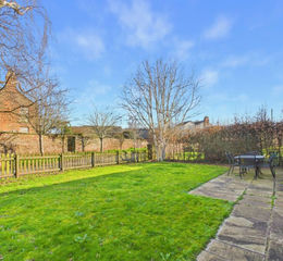 A paved patio seating area provides an ideal space for outdoor dining and entertaining. Beyond this, the garden is laid mainly to lawn and enclosed by an attractive picket fence boundary with mature trees creating a pleasant outlook across the surrounding courtyard setting.