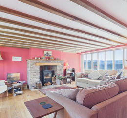 The Sitting Room (18'2" x 17'5" / 5.54m x 5.30m) forms an impressive main living space and enjoys a striking wall of floor to ceiling glazed panels to the rear, flooding the room with natural light while beautifully framing views across the surrounding countryside. Exposed ceiling beams and attractive oak flooring enhance the character of the room, while a substantial stone fireplace with raised hearth houses a recessed wood burning stove, creating a warm and inviting focal point. Glazed double doors provide direct access to the garden seating area.