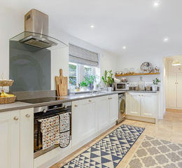 - Light-filled living spaces with solid oak flooring and exposed beams.