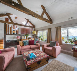 The entrance hallway provides a welcoming first impression, complete with a handy cloak cupboard and access through part-glazed doors to the principal reception rooms. The living room is a particularly impressive space, centred around a multi-fuel burning stove and enhanced by exposed vaulted ceiling beams. Dual aspect windows flood the room with natural light, while a door leads directly to the rear. A unique feature of this room is the staircase rising to an open mezzanine level, currently used as a home office, offering excellent flexibility for additional living or workspace. This area is further enhanced by a circular feature window, skylight, and built-in storage.
