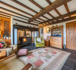 The dining room, also suitable as a sitting room, continues the characterful theme with flagstone flooring, exposed beams, and a solid fuel-fired ESSE Ironheart set within the original fireplace. This creates a warm and inviting focal point, complemented by views over the front garden. A staircase leads to the first floor from this room.