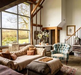 The barn itself blends character with thoughtful modern additions. The principal living space is particularly striking, with its vaulted ceiling, a statement log burner and an impressive expanse of glazing that draws light across the stone flooring throughout the day. Every window frames uninterrupted views of the surrounding countryside, while a mezzanine landing above leads to three bedrooms and two bathrooms, creating a natural sense of height and openness.