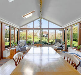 Continuing through, the kitchen offers ample space and is complemented by a useful utility/boot room with direct access to the garden. From the kitchen, you enter the sizeable dining room, which in turn opens into an impressive garden room. Flooded with natural light from Velux windows and large glazing, this space provides stunning views over the extensive grounds and is ideal for entertaining or relaxing.