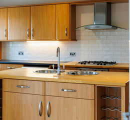 Kitchen/Breakfast Room - 18'11" x 9'8" - The kitchen is well arranged for both family life and entertaining, fitted with a range of wall, floor and drawer units with work surfaces over and a central island incorporating twin circular sinks and drainer. Integrated appliances include twin electric ovens, a gas hob with extractor hood over, dishwasher, fridge and wine rack, with additional space for an under-counter freezer if required. Double glazed sash-style windows to the rear and side bring in natural light, while the open-plan layout allows the kitchen to flow naturally into the dining space and adjoining reception areas.
