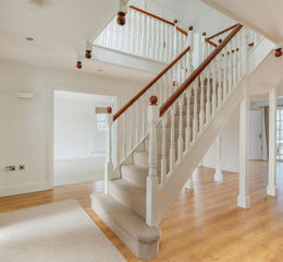 Entrance Hall - A composite door with obscure glazed inserts opens into a welcoming central hallway, immediately setting the tone for the house. Oak engineered flooring runs through the hall, while the striking staircase rises ahead before splitting to the left and right at first-floor level, creating a strong first impression. A built-in double cloaks cupboard provides excellent storage, and there is internal access to the integral garage.