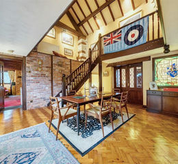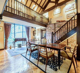 The kitchen is a generous farmhouse-style space with fitted units, exposed chimney breast with log burner, and direct access to the dining room, which is an impressive double-height reception room overlooking the courtyard.
