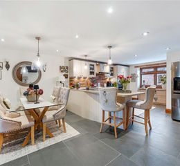 The part glazed door opens into the entrance hall which has a staircase that rises to the first floor and opens up to the gorgeous living kitchen. The beautiful living kitchen space has plenty of space for both dining and lounging to suit the buyer. The kitchen itself has been upgraded by the vendors in a timeless style befitting a barn conversion of this quality. With a range of shaker kitchen units and contrasting work surfaces incorporating a highly sociable breakfast bar, integrated appliances include induction hob with an extractor over, double oven, microwave, dishwasher along with a 1.5 sink and a point for a fridge freezer. There is a pantry style storage cupboard off the kitchen along with a well-equipped utility room which has a point for a washer, a drinks fridge and a range of units. The boiler is also found in here.