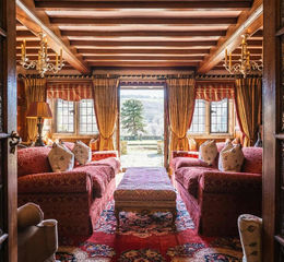 Reception Hall - 8.00m x 4.65m (26'2" x 15'3") - Extending a palatial welcome, the reception hall enjoys views of the gardens and beyond through rear facing leaded glazed windows with window seats beneath. Also having exposed timber beams, pendant light points, oak panelling to the walls, wall mounted light points, cast iron central heating radiators, TV/aerial point and herringbone parquet flooring. A built-in oak cupboard with double doors contains shelving. The focal point of the room is the gritstone fireplace with a brick surround/hearth and an intricately carved overmantel. Oak doors open to the sitting room, drawing room, formal dining room and inner hall. Double oak doors with leaded glazed panels open to the rear.