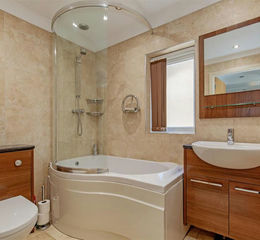 Luxury Family Bathroom - 2.18m x 1.70m (7'2" x 5'7") - Stunning fully tiled family bathroom comprising of a quality 3 piece suite comprising of a shower bath with mains shower and shower screen, wash hand basin and low level WC set within modern Walnut vanity cupboards. Attractive complementary wall mirror and chrome heated towel rail. Tiled flooring.