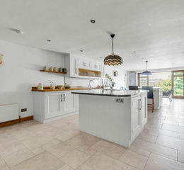 At the heart of the home lies an exceptional open-plan kitchen, which has been designed for both everyday family life and entertaining. This remarkable space comfortably accommodates two separate islands: one dedicated to preparation, complete with its own sink, hot water tap, dishwasher and storage; the other designed for socialising, featuring a breakfast bar positioned to take full advantage of the breath-taking garden and countryside views, alongside an easily accessible built-in wine cooler.