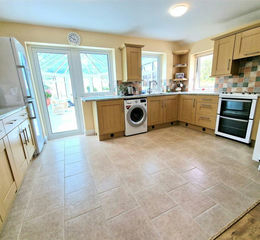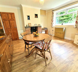 To the rear, the kitchen and dining room stands out as a particularly sociable and functional space, with good storage, extensive work surfaces, room for freestanding appliances and a woodburning stove set within a brick surround with slate mantle.