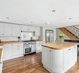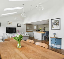 Kitchen/Dining Area/Family Room - 7.56 x 7.52 (24'9" x 24'8") - To the rear of the house, the home opens up into an impressive kitchen/dining/family space designed with modern living in mind. Flooded with natural light from multiple Velux skylights, rear-facing windows and French doors, this is a bright and sociable beating heart of the home. The kitchen is well-appointed with a range of wall and base units, solid wood work surfaces, a central island with breakfast bar and space for an American-style fridge freezer. There is also a butler sink, integrated dishwasher and underfloor heating, while ample space remains for both dining and seating areas overlooking and opening into the garden. There is a secure front door which leads to the front of the property ideal for day to day access, deliveries and shopping unloading.