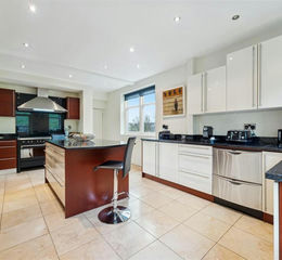 At the heart of the home lies a substantial breakfast kitchen, beautifully appointed and centred around a large island. Extensive cabinetry, integrated appliances and ample space for informal dining and family gatherings ensure this room functions as both a practical workspace and a sociable hub. A utility room provides further convenience and organisation.