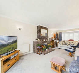 Feature brickwork fireplace, double glazed sliding patio doors opening to rear garden, UPVC double glazed bow window to front, two radiators.