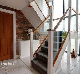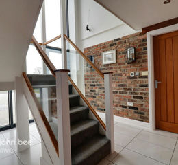 A magnificent triple height entrance hall, with exposed brick walls to ground floor and glazing from floor to ceiling. The staircase has glass balustrades. Doors to lounge, kitchen/diner and cloakroom. Under floor heating. Downlights.