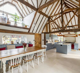 The heart of the home is a spectacular open-plan kitchen, breakfast, and dining room. With its vaulted ceiling, exposed beams, and picture window, this is a space designed for both family life and entertaining. The kitchen has been reimagined with a contemporary farmhouse style and features extensive cabinetry, a central island, and a charming bay window seat. A large utility/boot room sits alongside, with bespoke storage. From here, a ground-floor guest bedroom with en-suite shower room completes the accommodation in this wing.