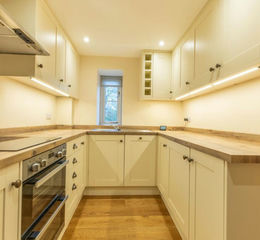 The accommodation is arranged over three floors and briefly comprises an entrance hallway, kitchen and a good sized living room with French doors opening out onto a patio, creating a natural connection to the outdoors. The ground floor benefits from oak flooring throughout and oak veneered internal doors, adding warmth and quality. To the first floor are two bedrooms, one with a full wall of fitted wardrobes and a family bathroom, while the second floor provides a generous principal bedroom with en-suite shower room with underfloor heating. A Nest controlled electric heating system provides efficient and convenient temperature control.