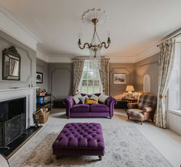 More formal rooms are found at the front of the house, accessed from either side of the grand entrance hall with its tessellated floor and sweeping staircase. The drawing room features an open fireplace, sash windows, original wooden shutters and elegant ceiling heights, while the opposing formal dining room mirrors its proportions and period charm. Both rooms enjoy southerly views across the gardens and rolling countryside beyond.