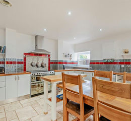 The dining kitchen has a range of fitted units, space for freestanding appliances, and ample room for a dining table. Double doors open into a timber-framed garden room, with French doors leading out to a patio area. At the opposite end of the house is a further reception room, equally light-filled thanks to ample glazing. Completing the ground floor is a large utility room with space for white goods, and a downstairs cloakroom, both accessed from the entrance hall.