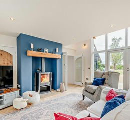 Entering the property, a central entrance hall with flagstone flooring provides access to the ground floor accommodation. To the right lies the main reception room, a striking part-double height space with floor-to-ceiling glazing to both the front and rear, filling the room with natural light. A feature fireplace houses a log-burning, while double doors lead seamlessly through to the dining kitchen.