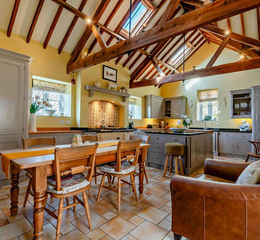 At the heart of the home lies the stunning open plan living kitchen—truly one of the property's highlights. Designed in a traditional shaker farmhouse style, it boasts a dramatic vaulted ceiling, granite and solid wood worktops, a gas-fired AGA, integrated appliances including a dishwasher, fridge, and fridge freezer, and a central island with a double Belfast sink. Windows offer views across the front garden, and a door leads directly into the conservatory that is flooded with natural light, featuring floor-to-ceiling glazed doors that open to a patio and the formal walled garden.