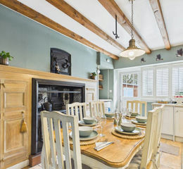 A back hallway with wooden flooring leads to further accommodation, including a second kitchen/dining area. This open plan space features modern cabinetry with contrasting worktops, oven, fridge freezer, induction hob, dual aspect windows with shutters, a back door, boiler, large cooking stove, radiator, ceiling beams and a wood burning stove alongside a range cooker.