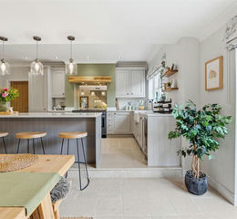 Kitchen/Diner - 7.03 x 5.60 (23'0" x 18'4") - A variety of Shaker wall and base units, Quartz worktops and kitchen island, integrated fridge/ freezer, wine fridge, Neff dishwasher and washer/dryer, Rangemaster Cooker, extractor fan, double Belfast sink with boiling tap, large breakfast style cupboard with integrated microwave ,Dijon tumbled limestone flooring, a central heating radiator, window and french doors to side and stairs to the first floor.