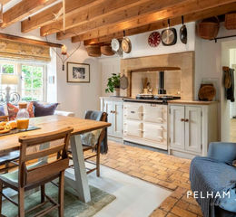 Step through the hallway into the kitchen and feel the slow and subtle embrace of country comfort. Beneath the warmth of exposed timber, the flagstone and tile floors mark the changing zones of life: from practical prep space to the softly lit dining area, where there is ample space for a family-size farmhouse table. Natural light spills in from the shuttered window, whilst the Aga cooker, nestled in its stone inglenook, pumps out restorative warmth, also flowing from underfloor heating. The traditional larder with practical racks for herbs and spices is ideal for home cooks and aspiring chefs.