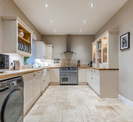 At the heart of the house is the open-plan kitchen, dining and living space, a beautifully judged room that feels both expansive and intimate. Double doors open directly onto the garden, drawing in natural light and creating a seamless connection between inside and out. The kitchen itself is a particular highlight, fitted with bespoke cabinetry, oak work surfaces, a classic butler sink and a range of high-quality integrated appliances, combining practicality with understated elegance.