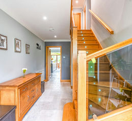 The welcoming hallway offers an immediate sense of space, providing access to the main reception rooms. Stairs rise to the first floor and there is practical storage beneath. Large windows allow natural light to flow through, highlighting the generous proportions. This area acts as the central hub of the home, linking the reception spaces with the kitchen and dining area, creating a practical layout for both everyday living and entertaining.