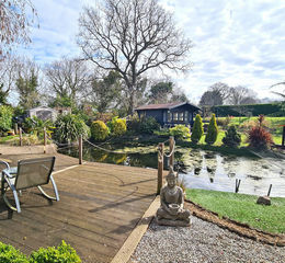 A paved patio area adjoins the living rooms bi-fold doors, and provides a relaxing outside space, with a pathway leading onto timber decking, which overlooks the large coy pond. The path continues around the pond, where an oriental-style arch and bridge provide access onto a lawned 'island' space, with timber summer house.