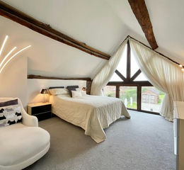 From the moment you step inside, the home’s heritage is immediately apparent. Beautifully preserved, over 100-year-old elm wood doors run throughout, complemented by solid oak-framed, double-glazed windows and glazed doors that enhance both warmth, energy efficiency, and authenticity. Exposed beams feature prominently across the property—almost all of which are structural—creating a sense of integrity and craftsmanship, with only one non-structural beam located in the master bedroom.