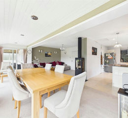Upon entering the property at ground floor level, you are welcomed by a light-filled and spacious entrance hall, which leads through to an impressive open-plan living space. The contemporary kitchen is superbly appointed with a range of high-quality fitted appliances, complemented by elegant granite work surfaces and a central breakfast bar. This seamlessly flows into a striking dining and sitting area, where floor-to-ceiling glazed windows to the rear elevation perfectly frame the far-reaching countryside views. A modern wood-burning stove provides an attractive focal point, while the generous ‘L’-shaped layout comfortably accommodates both formal dining and relaxed seating areas. A seperate WC is located by the front door.