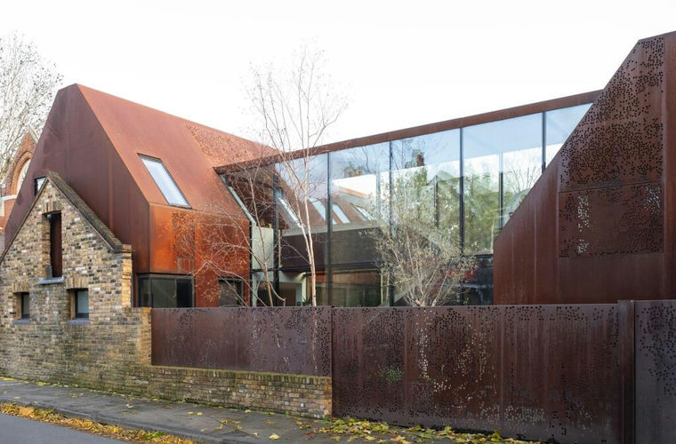 Its design retains the original stable wall at the front and reinterprets its gabled form across a pair of two-storey wings clad in pre-weathered Corten steel. Intricate Moroccan-inspired perforations in the steel filter dappled light into the interiors while framing outward views and creating a dialogue with the surrounding greenery.