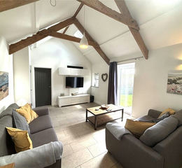 Stepping inside, you are welcomed into a bright and spacious openplan lounge, kitchen and dining area, where high quality décor and a stylish finish immediately create a sense of comfort and refinement. Exposed wooden beams add rustic charm, while a centrally positioned log burner offers a warm and inviting focal point. The modern kitchen is fitted with integral appliances including a hob, oven, microwave and dishwasher.