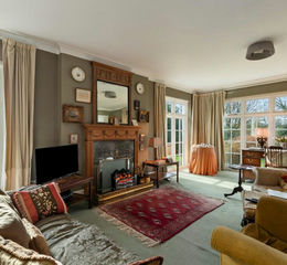 The principal reception room in the property, this charming sitting room benefits from two graceful floor-length windows and a set of patio doors offering views and direct access to the expansive garden. A charming traditional fireplace provides a warm and inviting focal point within this generous living space. Double inner doors open to the dining room.