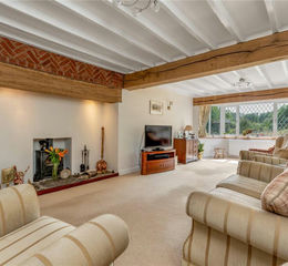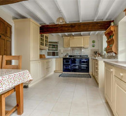 With a built-in AGA, one and half plus drainer polycarbonate sink with swan mixer tap and granite U-shaped effect preparation work surfaces. There are a series of cream fronted base cupboards and drawers with wall cupboards over, display cabinet and concealed lighting under. Integrated within the kitchen is a dishwasher, built-in microwave and fridge/freezer. With further matching work surfaces and a series of drawers and cupboards. There are two leaded light windows to the rear with deep oak sills, feature service hatch to the hallway. exposed beamed ceiling, tiled flooring and feature fireplace. Half glazed door to the rear garden.