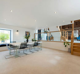 The front door opens directly into the impressive kitchen/living space, which features porcelain-tiled flooring and an amazing vaulted ceiling with exposed beams. The modern feel is complemented by the contemporary style kitchen, with a few steps leading down to the spacious dining room. On this lower level there is also a cloakroom, as well as a study. From the main kitchen/living space, some steps lead up to the generously proportioned sitting room, which is a on mezzanine level above the dining room, with a glass balustrade overlooking the kitchen. A long corridor from the kitchen leads through to the bedroom wing, where there are four double bedrooms, each having their own ensuite bath/shower room, as well as a separate sitting/family room, with bifold doors to the garden.