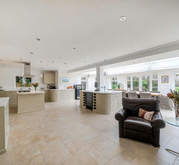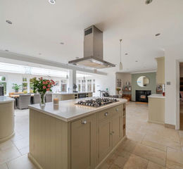 On entering there is a most impressive split level and vaulted reception hallway flooded with light and with a glazed panel staircase to the galleried landing and first floor accommodation. The generously proportioned drawing room features a brick Inglenook fireplace with log burning stove and is a dual aspect room with French doors to the rear garden. A feature of note is the magnificent open plan kitchen which incorporates a orangery dining area where a bespoke 20ft 14 seat dining table provides a perfect space for entertaining. The room overlooks the private westerly gardens and also incorporates a snug reading area with log burning stove. Supplied by Neptune Kitchens the hand finished units have ample white granite work surfaces and two stunning granite topped island units. Integral appliances include two Bosch dishwashers, Fisher & Paykel American style fridge freezer, a Bosch double oven, a six ring gas hob and a wine cooler.