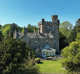Built of sandstone with a slate roof in the domestic gothic style, the house has a four storey embaffled tower to the rear with an octagonal corner turret.