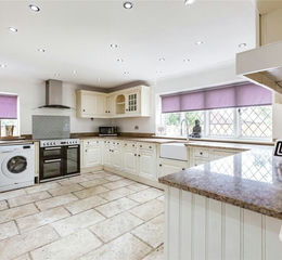 15'9 x 11'3. Double glazed windows to rear and flank, double glazed door to front, range of base level units with granite work surfaces over, inset Butler sink unit with mixer tap, spaces for all domestic appliances, range of matching eye level cupboards, tiled flooring, smooth ceiling with cornice coving and inset spotlights.