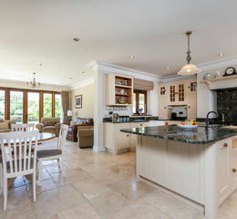 The very generous and welcoming accommodation is ideal for everyday modern family living and includes a stunning open plan L shaped kitchen/breakfast room with an adjoining family room and with multiple sets of doors opening out to the terrace and garden. The bespoke kitchen is set around a large island with a breakfast bar and is fitted with a range of cabinets, pan drawers, granite work surfaces, a Range oven with gas hob and appliances. The utility room with a butler sink and wooden work surfaces has door to boiler room and side door to outside. The accommodation includes a double aspect drawing room with a high ceiling and a reclaimed fireplace together with double doors to the garden and a dining room with a window seat and reclaimed limestone fireplace. The property also has the benefit of a study.